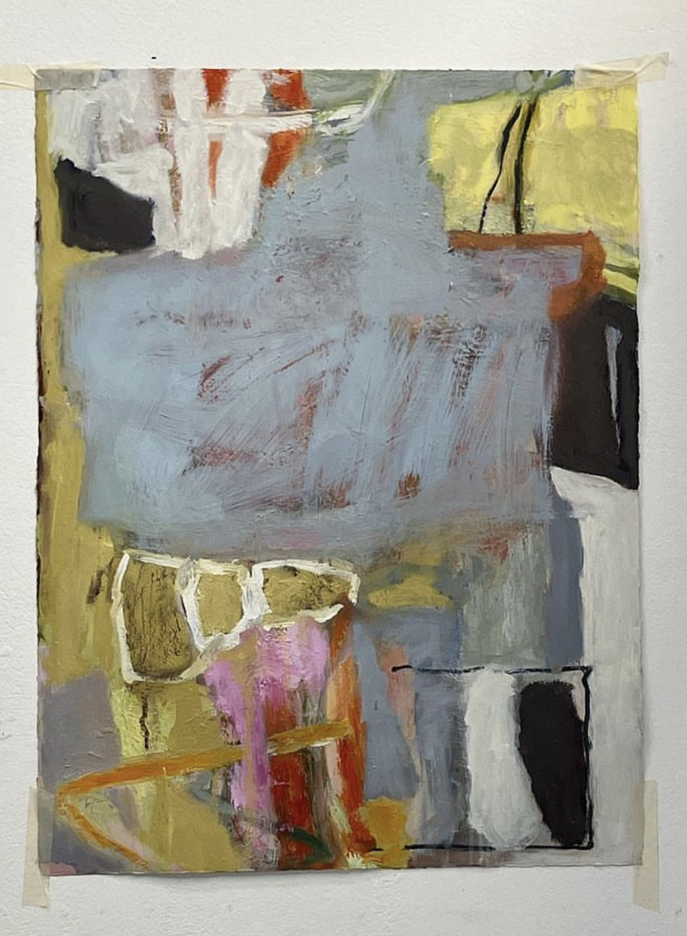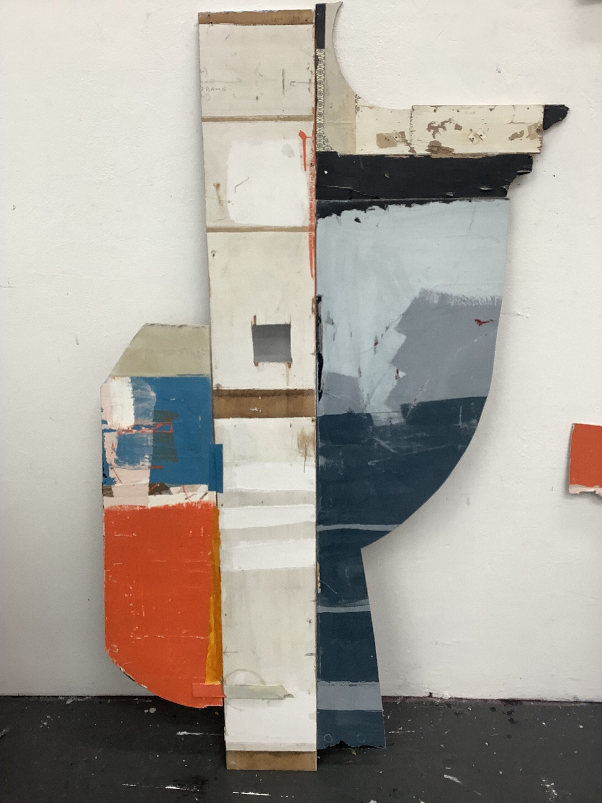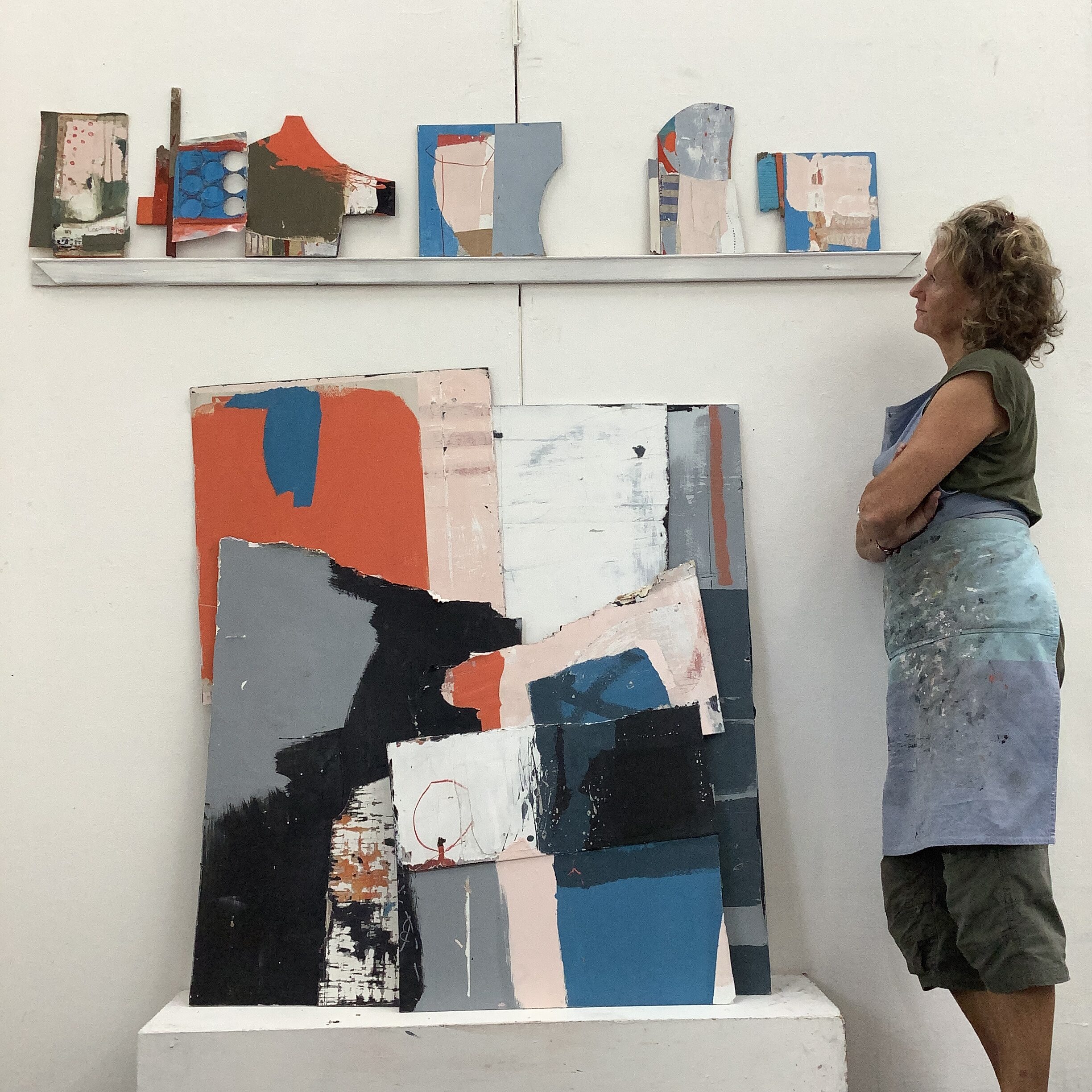 I have been working on my salvage series for at least six months, developing small studies of around 30cm to 40cm, in paint and paper collage on panels. This scale is fine in my small studio as I could place them of my shelves and on the back wall. But there is no way for me to expand into a series of bigger work, and to be able to hang and see them altogether. This was my aim for my two weeks, to make big work and to hang them together, large and small, and then see how they communicate with each other.