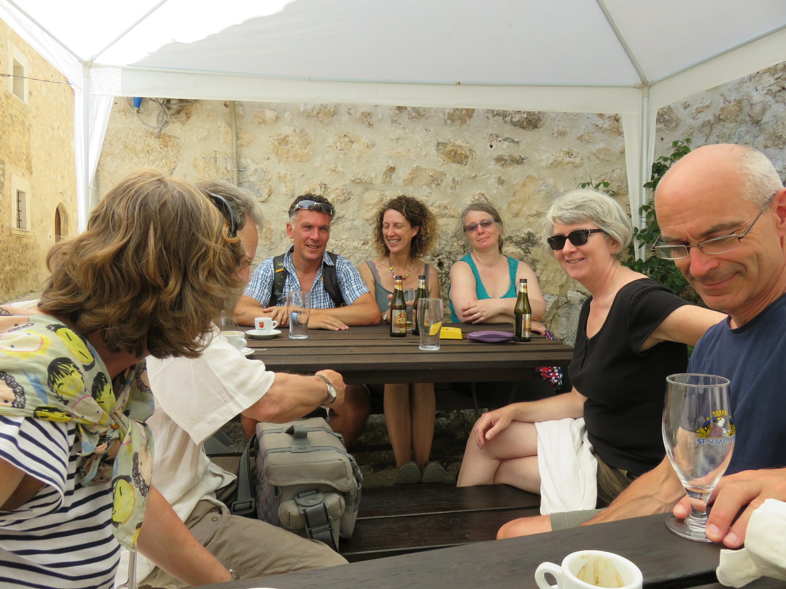 But the square was buzzing with all our new neighbours, dressed up for a spot of country dancing, a man making honey, ladies lace making,chopping salami and dancing, and a beautiful 12 year old girl playing the accordion. A lot of jolly singing and dancing then the first walking group set off and everyone sat down for a chat, I sketched.As soon as the next group appeared around the corner everyone leapt to life! Full on music, dancing, eating, and drinking for 10 minutes then all quiet again. After four hours of this we began to feel like performing chimps! Homemade lemon liquor made by such a sweet lady made me cross eyed. Then we walked slightly wobbly, up and down steps to dine in another square…..