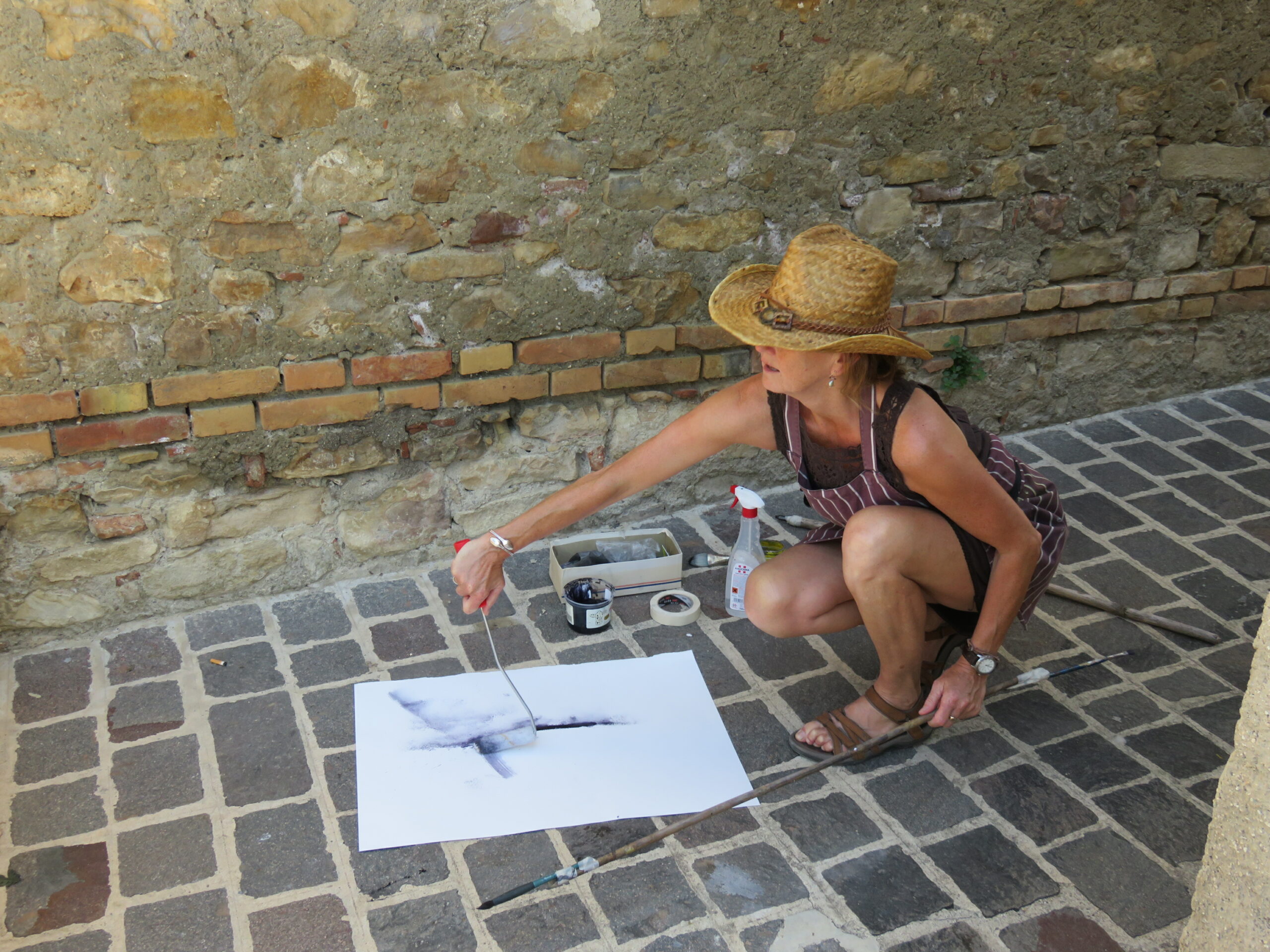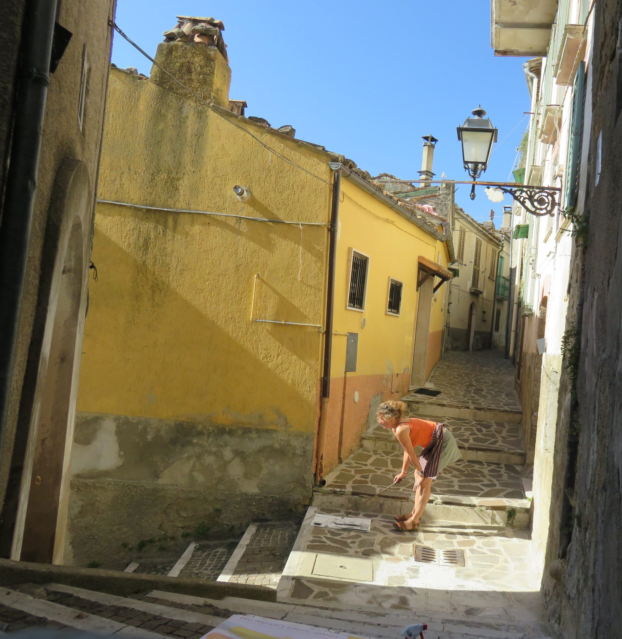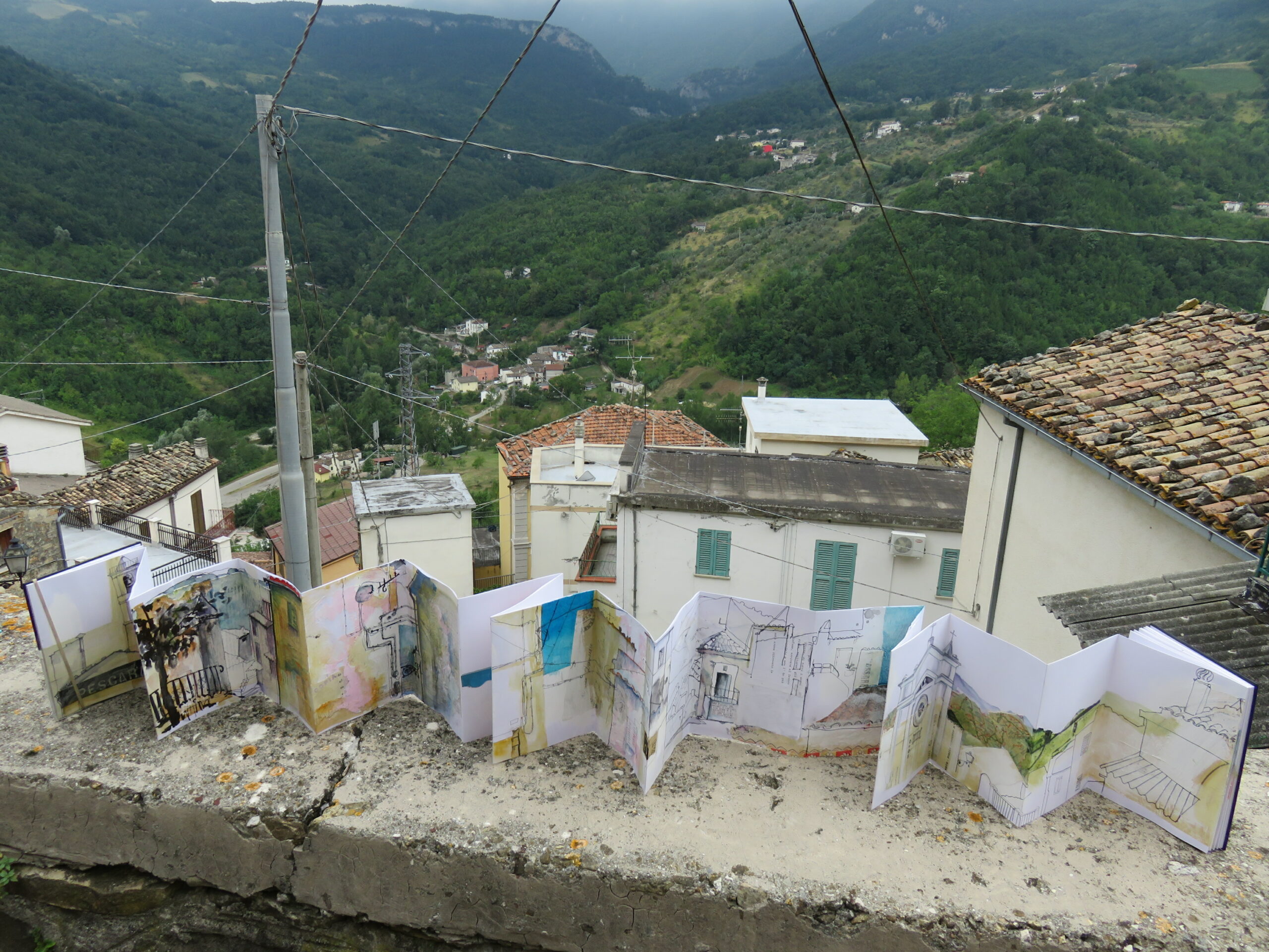 Arrived in Farindola, a small village perched on the mountainside in Abruzzo. Ten artists and three partners, on a two week residency organised by Paul and Helen Critchley – the first Farindola International Arts Festival. The next day we wake to stunning blue skies and scortching sunshine. We all start to organise our studio spaces and materials, we are painters, sculptors, printmakers and sketchers.