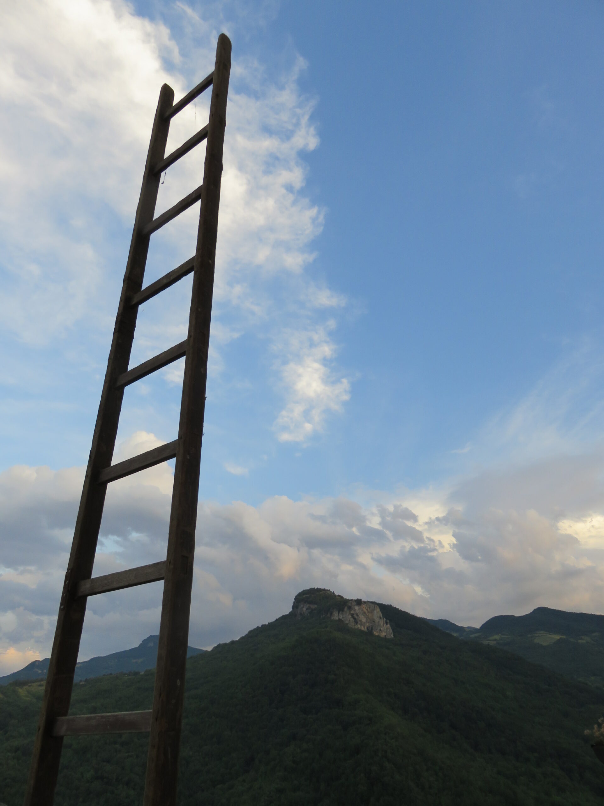 Claus wants to erect a ladder on the top of the church…! He has signed two disclaimers and only when the midday sun was burning high did they all go up and have ‘many discussions and fixings’. It is up! A ladder to the sky. Two pigeons perch on it, quite unimpressed, just before the grey skies rolled in with thunder and lightning…there is a rumour that God is not happy with the meddling’s on his church roof! Danny needs to move his carved stone head up and down steps to my studio, Melanie’s plaster is taking a long time to dry, Hans needs power for his laptop…I would just like my fan to rotate…:)