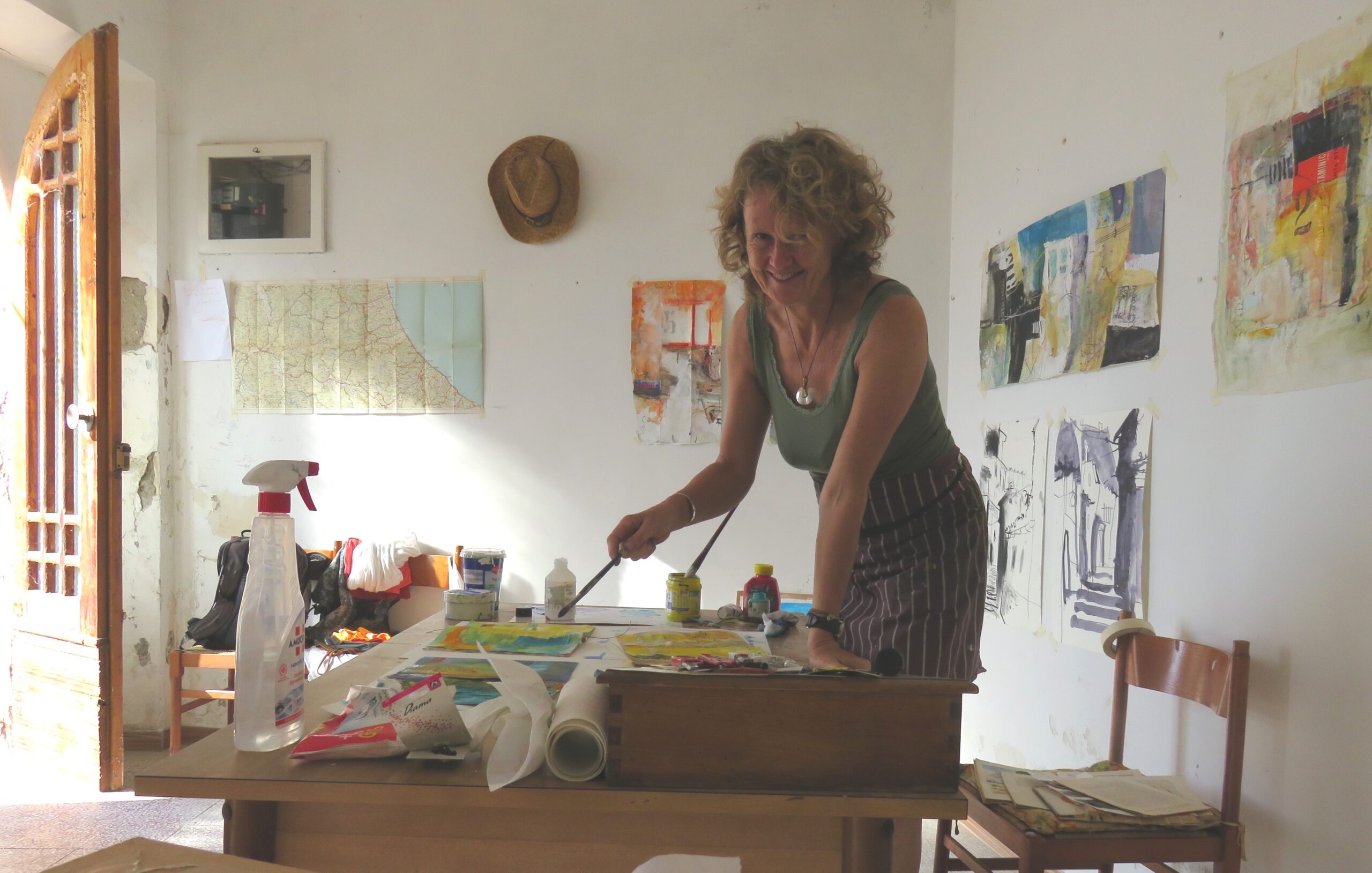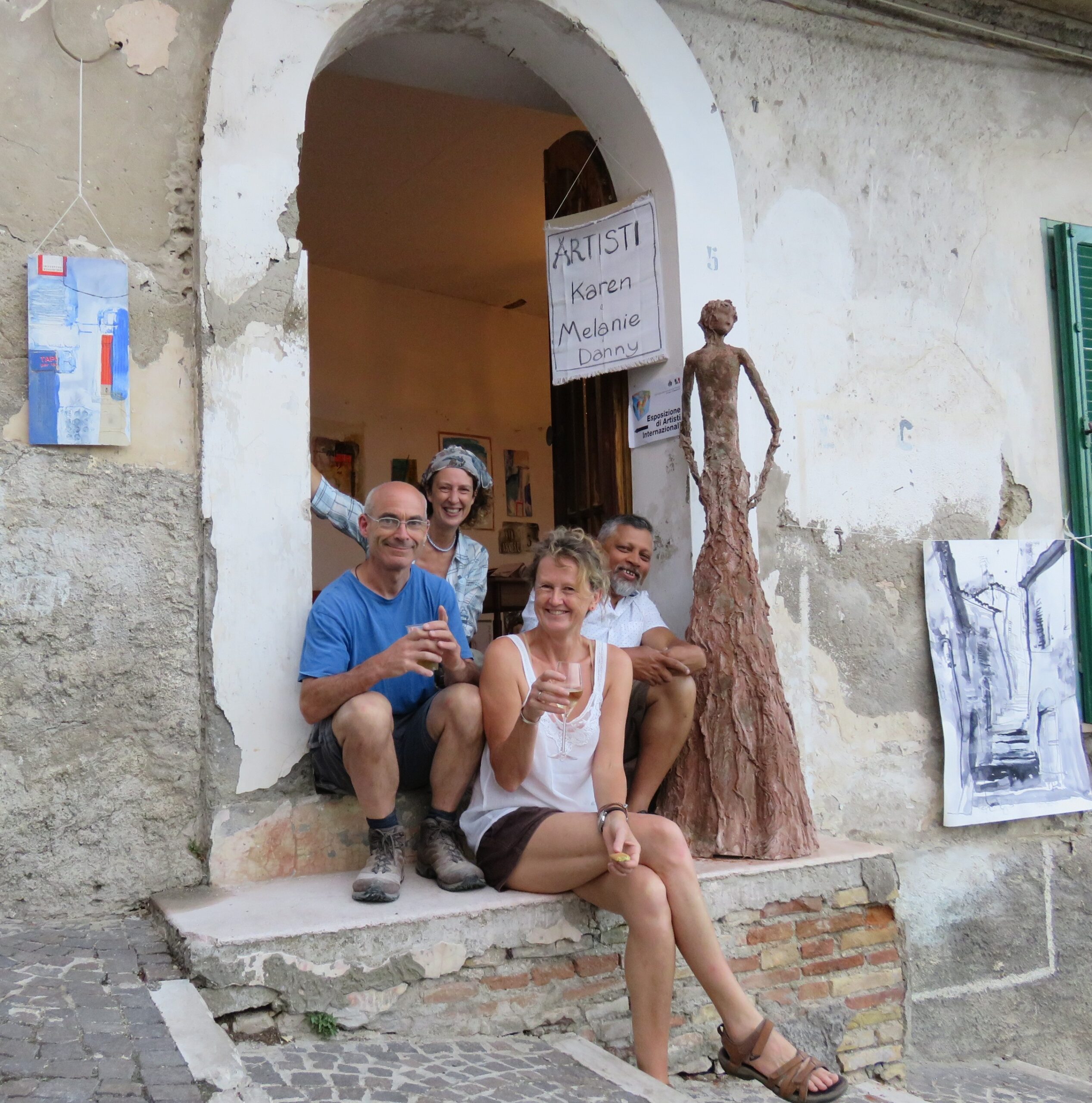 It’s now 9pm and we have another two hours of Open Studios before we catch the minibus back to the ostel; a group of tired, sweaty grubby artists (last night we just squeezed on before the band and all their instruments) One more night to go and we realise how much we are going to miss this place; the wonderfully open hearted locals, the italian ‘organisation’, Paul, Helen and Michael,our little band of pioneer artists, the magnificant scenery….’Grazie tutti’ I am sure we will be back.